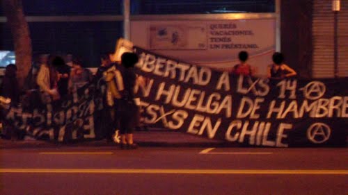 On Thursday the 17th, upon completion of 25 days of the hunger strike, from Buenos Aires, we decided to support our comrades kidnapped by the Chilean State. We descended on the Chilean consulate with banners and leaflets and blocked the roads, reading speeches from a megaphone in front of the consulate and surrounding areas. Then we went to Florida street, where we gave out leaflets to people passing by, explaining the situation that our comrades are living under, many people were supportive. With this humble activity we showed that solidarity has no borders, and even from a distance place we support our imprisoned comrades.