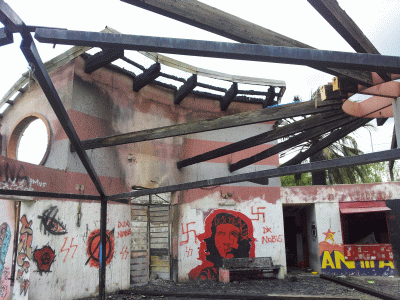 duce e le svastiche lasciate sui muri da chi ha appiccato l’infame rogo.